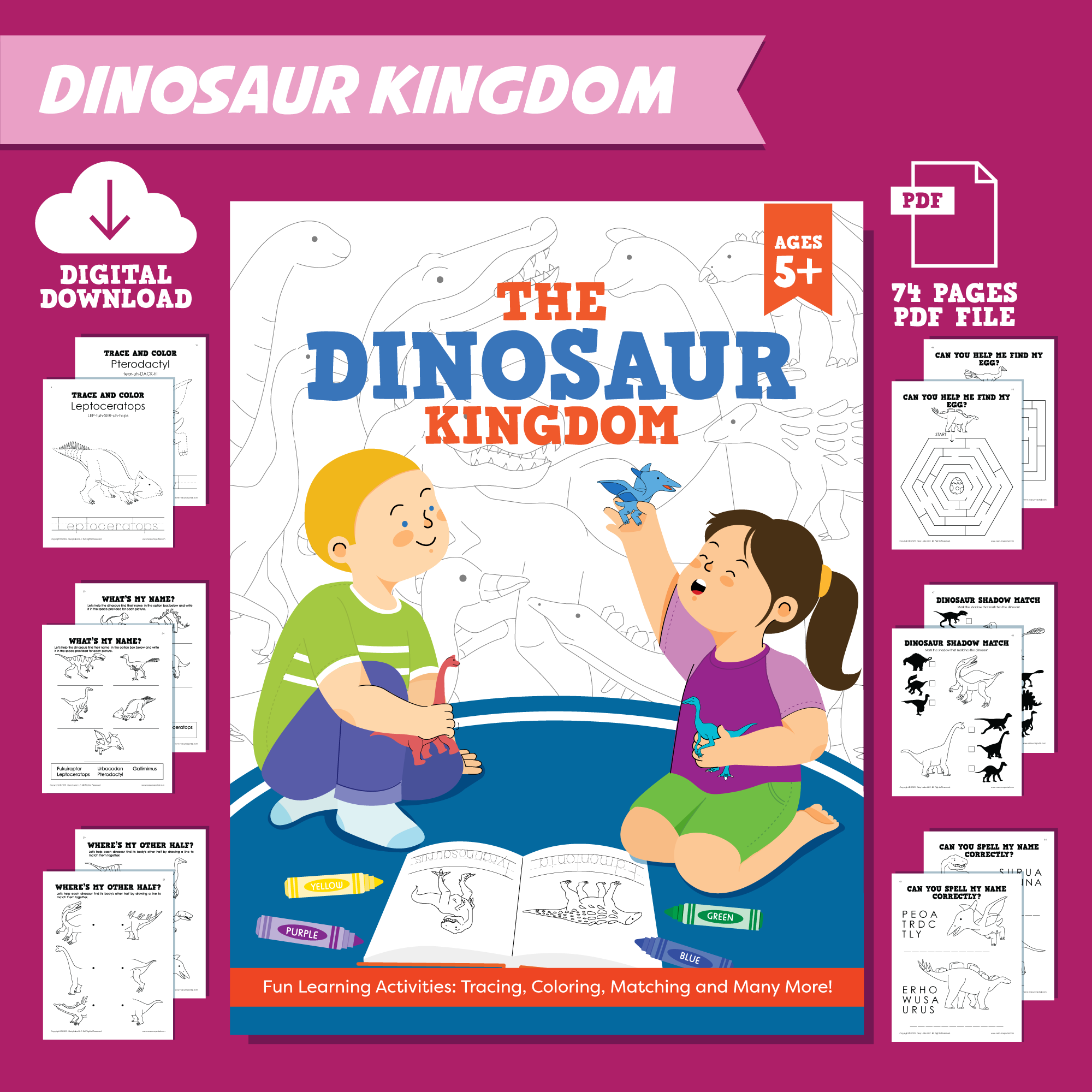 The Dinosaur Kingdom activity book provides hours of dino-related fun and learning. Your child will learn all about the different dinosaurs with pictures to color, fun puzzles to solve, and more! We have put together a variety of activity pages such as tracing to help familiarize with the names of dinosaurs, matching to enhance their recognition and fine motor skills, and identifying to help them get acquainted with over a dozen types of dinosaurs.