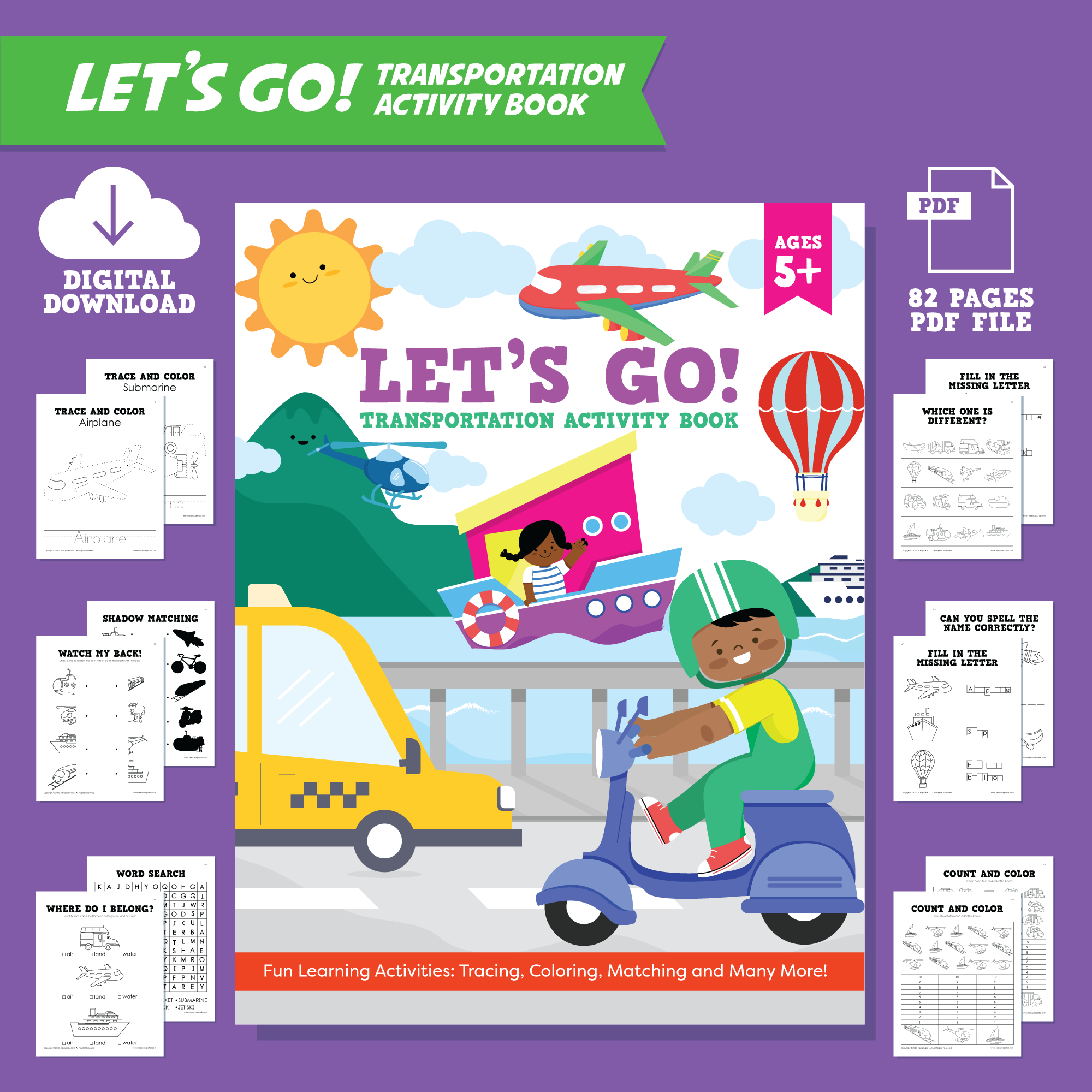This is an activity-packed book for your child to have hours of fun exploring the many different types of transportation in the air, water, and on land. We’ve included pages of dot-to-dot tracing and simple activity pages to make it fun for children to learn and identify the different forms; all while improving their writing and coloring skills. With multiple added activity pages, your child will be able to identify over a dozen different modes of transportation.